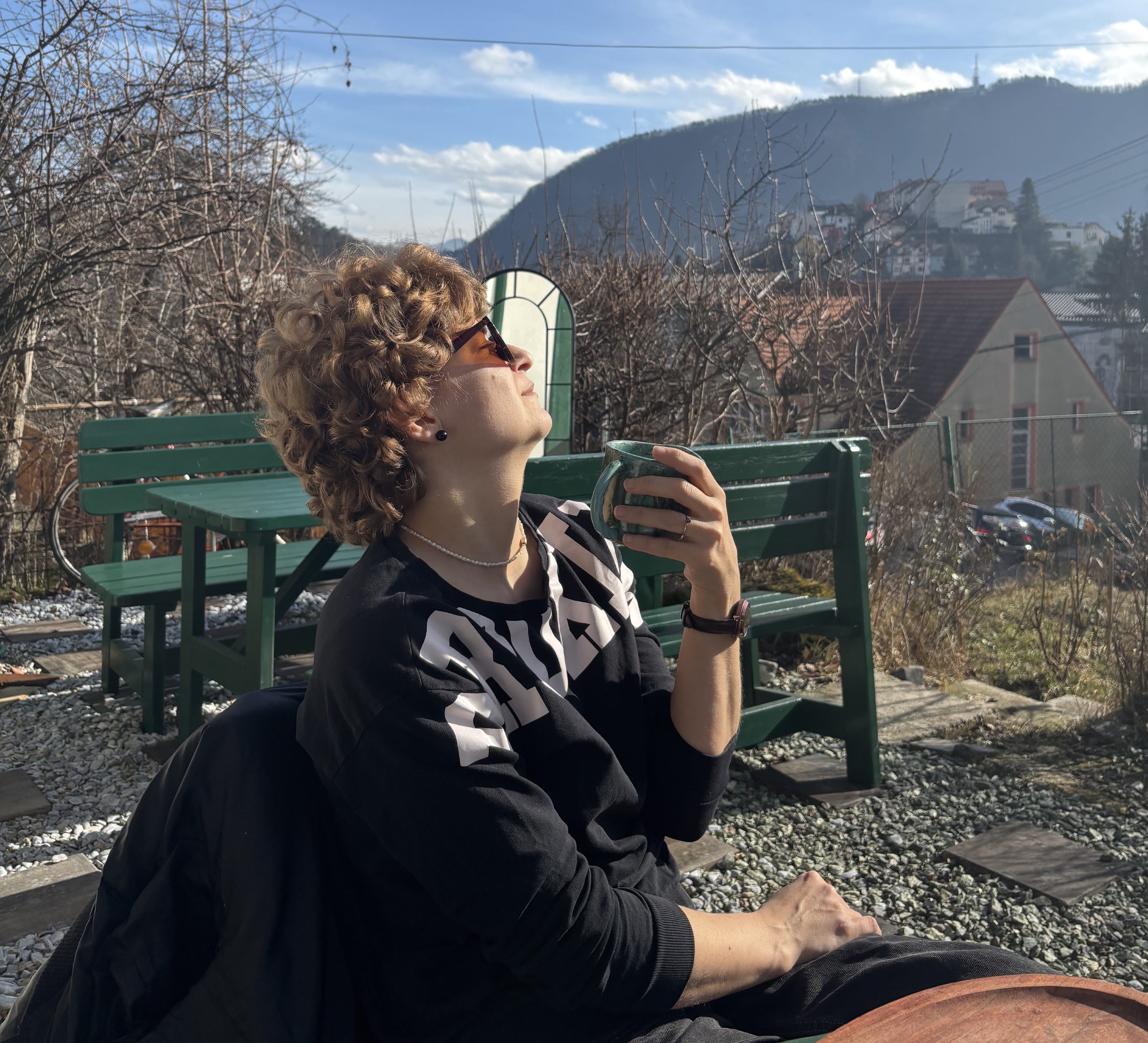 Uau, uite cafeaua asta! Multe lucruri... să beau cafea de specialitate. Îmi place foarte mult. Îmi place gustul. Dar îmi aduce bucurie să stau la cafea, la o cafea bună, așa, în soare, cum stăm acum. Să stau în natură. Să stau desculță pe iarbă. Acest conectat de oameni.